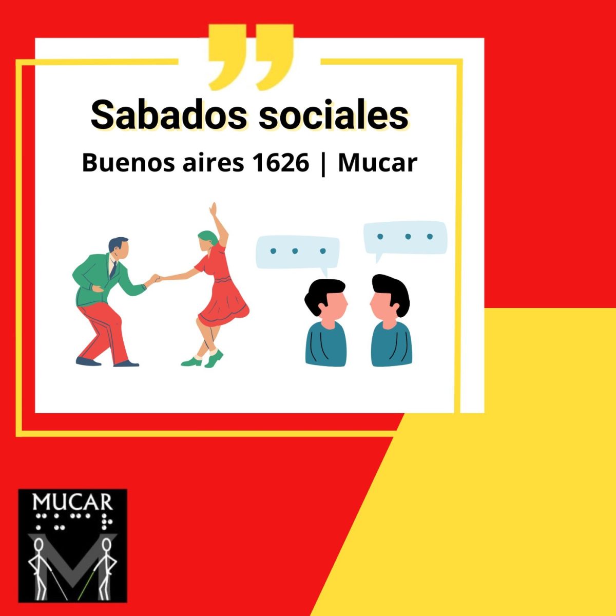 Sobre fondo rojo y amarillo, se ve Un recuadro blanco en el centro, donde se lee “sábados sociales”, con letras negras y comillas amarillas; debajo “Buenos aires 1626 | Mucar”, en negro.