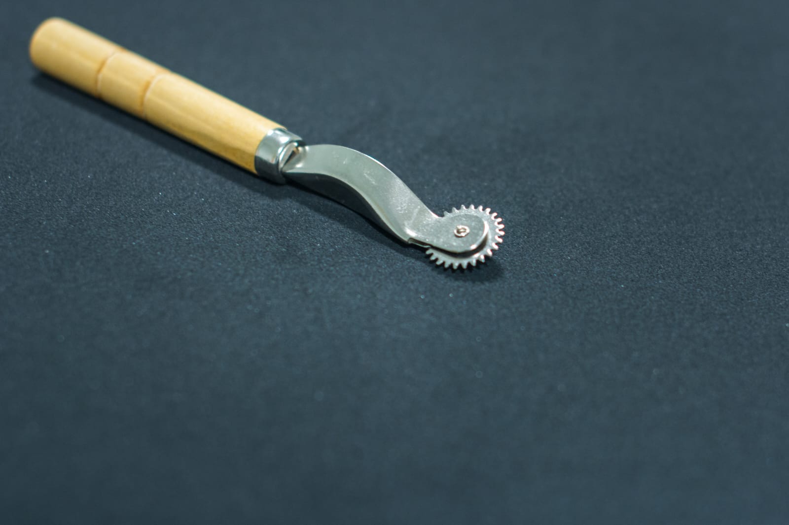 Tiralíneas con mango de madera acompañado de plancha de goma eva.